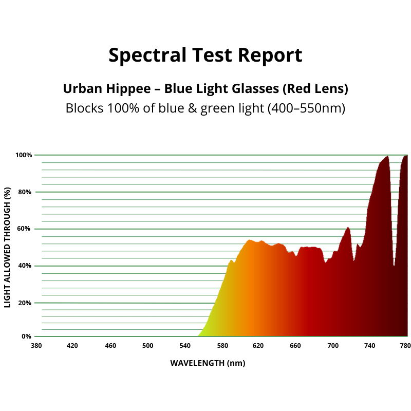 Our new Blue Light Sleep Glasses feature advanced red lens technology designed to block up to 100% of harmful blue and green light (400–550 nm) from all digital screens and indoor lighting — allowing your mind to switch off naturally and helping you achieve deep, restorative sleep.