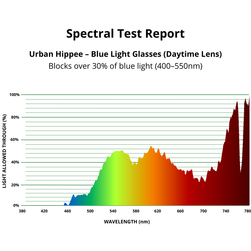 Urban Hippee’s CR-39 lens have anti reflective coating and have almost double the clarity of others available on the market. They have been tested to block up to 100% harmful blue light from 400nm to 550nm.