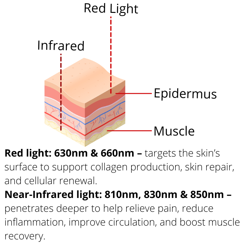 Red light and infrared therapy are known for their powerful, non-invasive health benefits. Red light (typically 660nm) targets the skin’s surface, helping improve skin tone, reduce wrinkles, and speed up wound healing. Infrared light (850nm and beyond) penetrates deeper, supporting muscle recovery, reducing joint pain, improving circulation, and enhancing mitochondrial function for better cellular energy. Together, they promote healing, reduce inflammation, and support overall wellness — all without UV exposure.